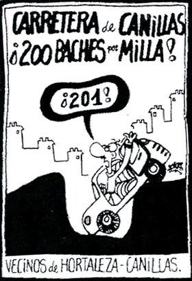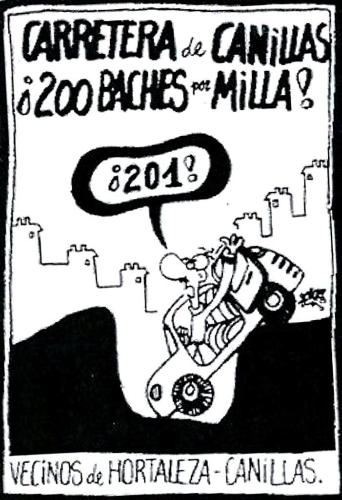 El popular lema de la protesta, 'Carretera de Canillas, 200 baches por milla', surgió tras una visita del dibujante Antonio Fraguas, 'Forges', al barrio, cuando el coche en el que viajaba con un vecino quedó atrapado en uno de los socavones de la vía.