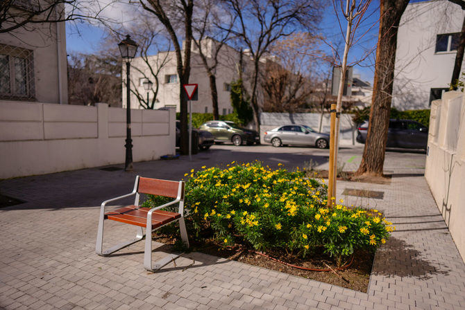 La actuación respeta el arbolado existente, incluye la plantación de nueve nuevos árboles y la pavimentación de alcorques y aceras circundantes mediante adoquín de pequeño tamaño que permite adaptarse a las raíces.