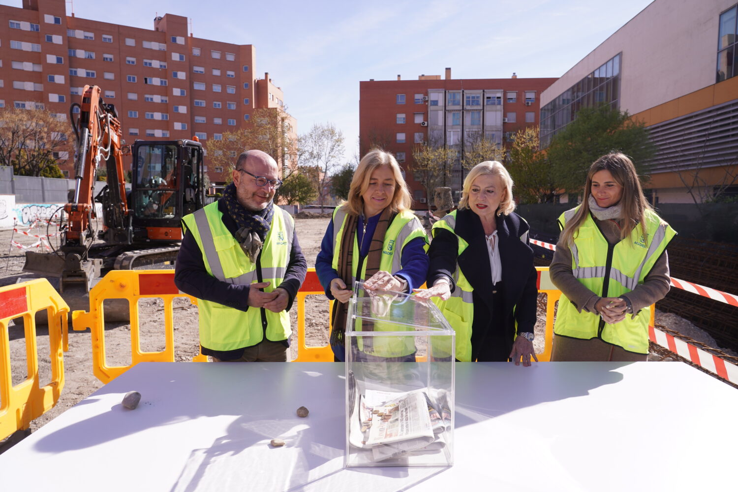 La vicealcaldesa de Madrid, Inma Sanz, acompañada de la delegada de Obras y Equipamientos, Paloma García Romero; del delegado de Políticas Sociales, Familia e Igualdad, José Fernández, y de la concejala de Usera, Sonia Cea, ha colocado la primera piedra de la escuela infantil.