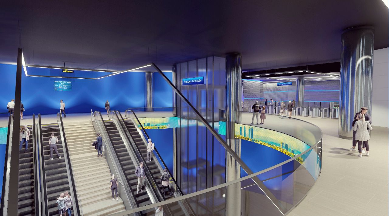Los trabajos para transformar la nueva estación en una nueva de 12.000 metros cuadrados, que como novedad pasará a llamarse 'Bernabéu', avanzan al 35%, de modo que está previsto que finalicen en el primer trimestre de 2027, coincidiendo con el 80 aniversario del estadio Santiago Bernabéu y los 125 años del Real Madrid.