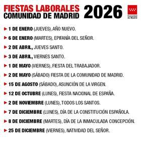 En concreto, en 2026 serán fiesta en toda España el jueves 1 de enero (Año Nuevo), el martes 6 de enero (Epifanía del Señor), el viernes 3 de abril (Viernes Santo), el viernes 1 de Mayo (Fiesta del Trabajo), el sábado 15 de agosto (Asunción de la Virgen), el lunes 12 de octubre ( Fiesta Nacional de España), el domingo 1 de noviembre (Fiesta de Todos los Santos), el martes 8 de diciembre (Día de la Inmaculada Concepción) y el viernes 25 de diciembre (Natividad del Señor).