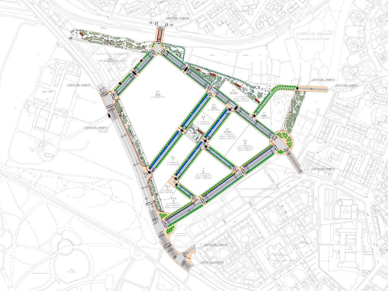 También se prevé el incremento del 65% del espacio reservado a equipamientos públicos y zonas verdes, pasando de 38.000 metros cuadrados (PGOUM 1997) a 59.000 metros cuadrados. De igual modo, se reservan 40.000 metros cuadrados para la construcción de un hospital de referencia para los distritos de Carabanchel y Latina.