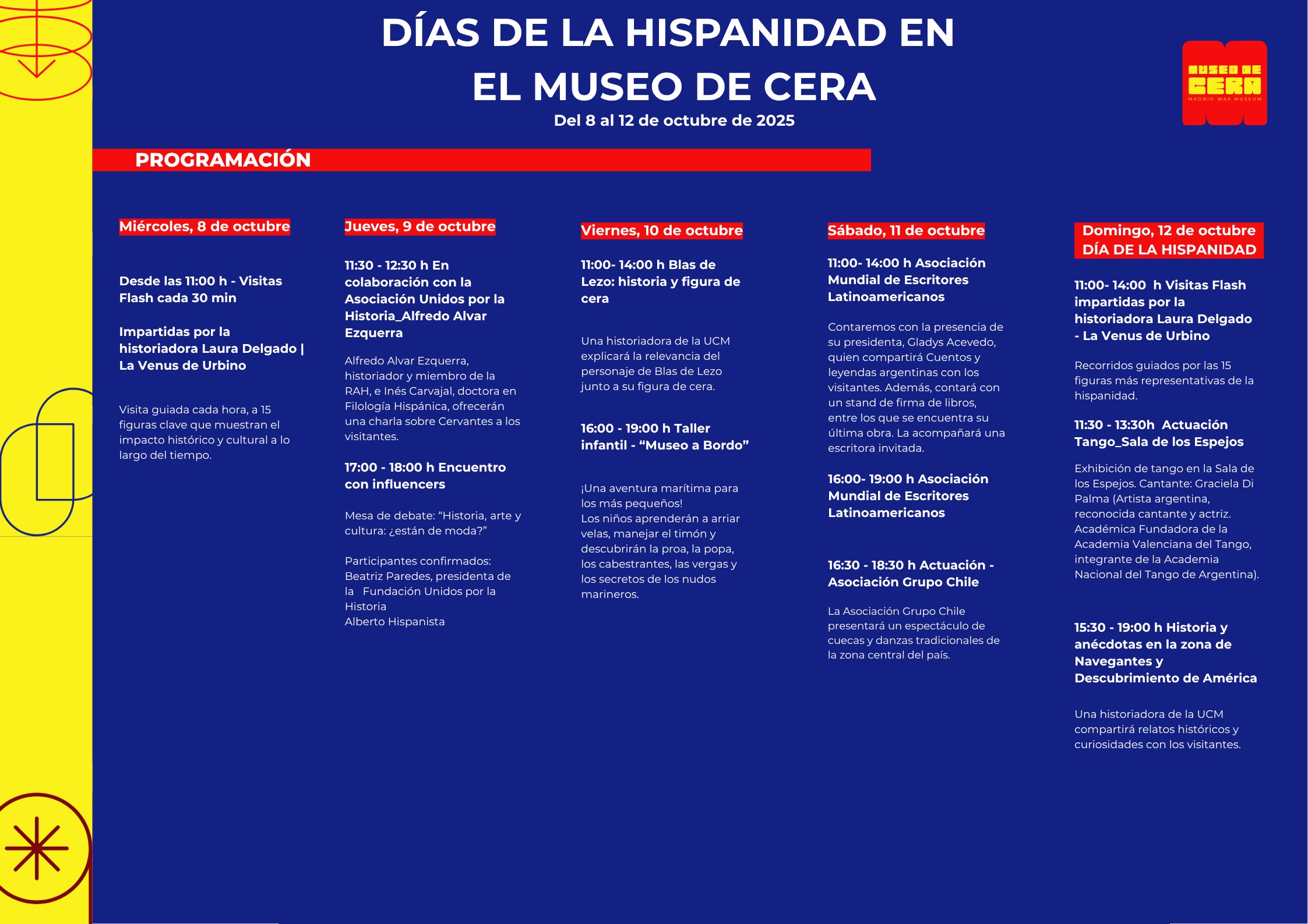 El Museo de Cera de Madrid celebra por primera vez los 'Días de la Hispanidad', un programa especial que, del 8 al 12 de octubre, llenará sus salas con un abanico de actividades incluidas con la entrada, pensadas para todos los públicos, con el objetivo de acercar la historia, la cultura y las tradiciones del mundo hispano de una forma accesible y participativa.