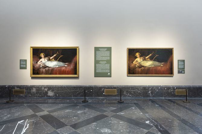 Como parte de la conmemoración de la recuperación del retrato de 'La marquesa de Santa Cruz', el Museo del Prado ha realizado una instalación especial en la sala 38 del Edificio Villanueva del original junto a una de las copias mencionadas, adquirida y restaurada por el galerista e historiador del arte, José de la Mano.