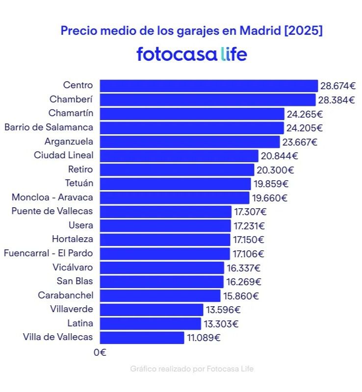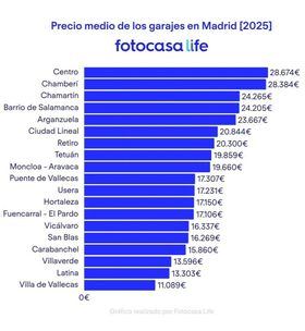 En cuanto a los precios, los garajes en venta más caros se encuentran en el distrito de Centro, con un precio de 28.674 euros, mientras que en Villa de Vallecas la media de los garajes en venta era de 11.089 euros en 2025.