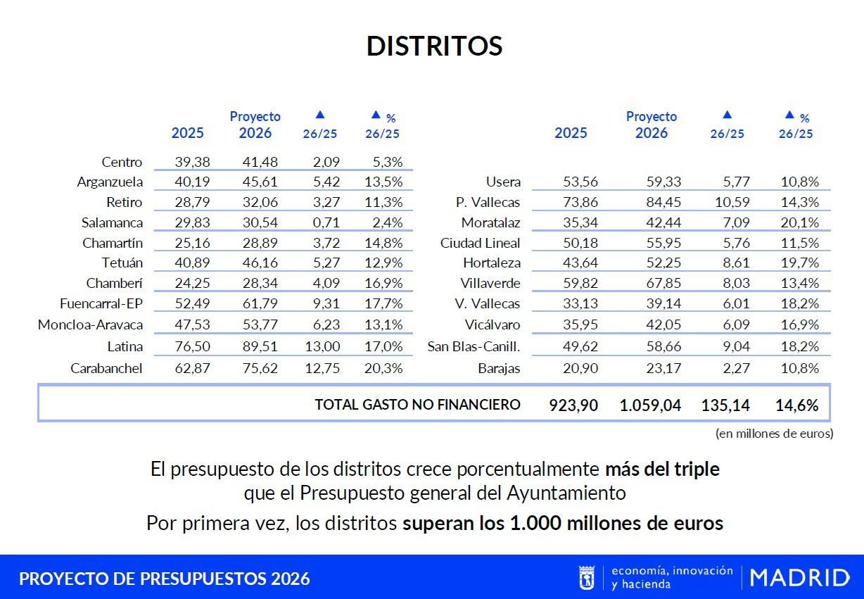 La Junta Municipal de Fuencarral-El Pardo ha presentado un presupuesto de 61,79 millones de euros para 2026, un aumento del 18,6% respecto a 2025. Se destinarán fondos a servicios sociales, culturales y educativos, con énfasis en la atención a mayores y a infraestructuras del distrito.