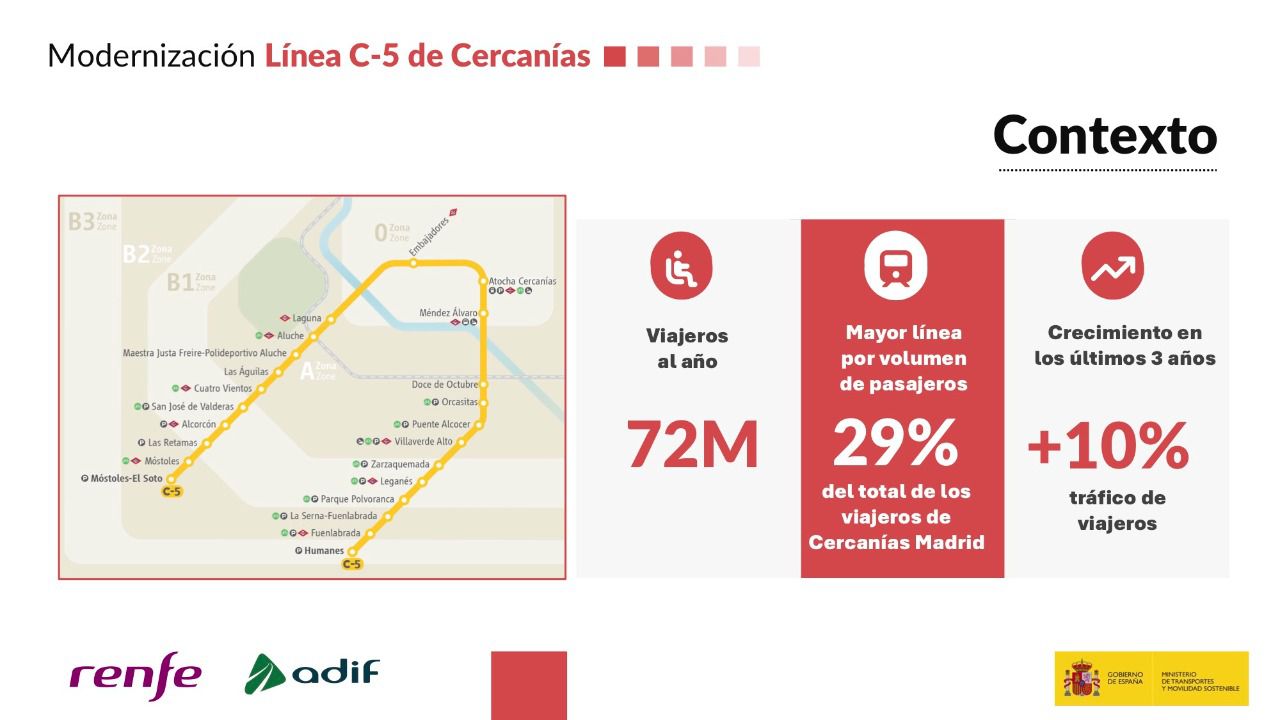 El ministro de Transportes y Movilidad Sostenible, Óscar Puente, ha anunciado una "inversión histórica" de 1.350 millones de euros para la renovación y modernización completa de la línea C-5 de la red de Cercanías de Madrid, que conecta Móstoles y Humanes, unos trabajos que se prolongarán, previsiblemente, hasta 2031 y que conllevarán cortes en el servicio durante los meses de verano de 2027 y 2028, una vez finalizadas ya las obras de soterramiento de la A-5.