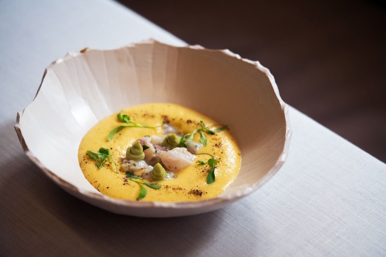 En la selección de mariscos y pescados, destacan el ceviche de lubina con maíz, tomate de árbol, maracuyá y coco, la raya frita con pil pil y kimchi, y el skrei con papapomodoro y bouillabaisse.