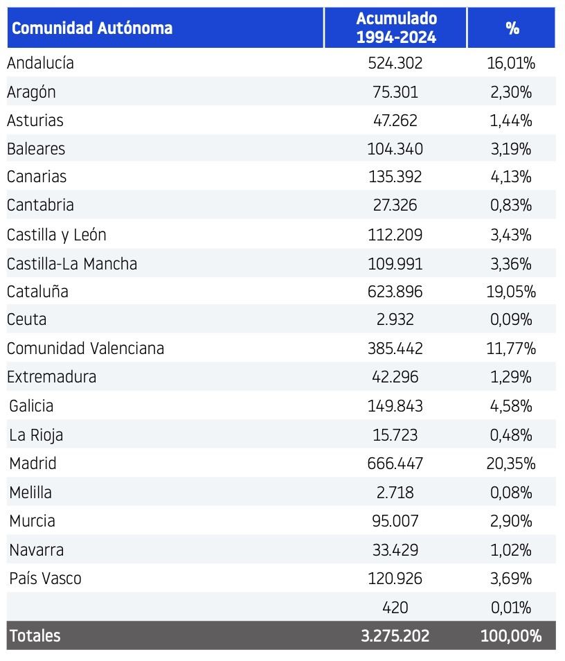 Madrid concentra el 20% de las constituciones de los últimos 30 años. Tras ella Cataluña con un 19% y Andalucía que reúne el 16%. Son las únicas comunidades que superan las 500.000 creaciones acumuladas.
