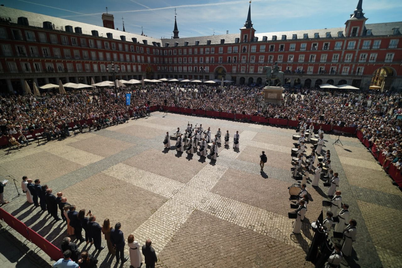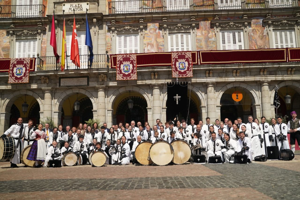 Cientos de asistentes han presenciado este Domingo de Resurrección la tradicional tamborrada en la plaza Mayor, donde han percutido decenas de tambores de la Cofradía de la Exaltación de la Santa Cruz, de Zaragoza, poniendo así el broche final a la Semana Santa en la ciudad de Madrid.