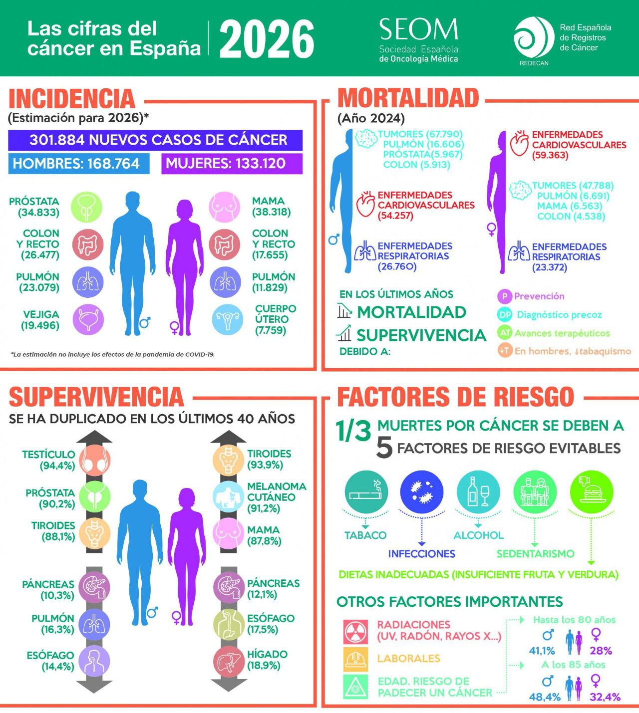El número de cánceres diagnosticados en nuestro país durante 2026 alcanzará los 301.884 casos, lo que supone un ligero incremento del 2% respecto a 2025, con 296.103 casos, según el informe 'Las cifras del cáncer en España 2026', elaborado por la Sociedad Española de Oncología Médica (SEOM) y la Red Española de Registros de Cáncer (REDECAN).