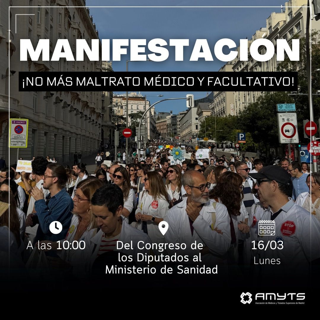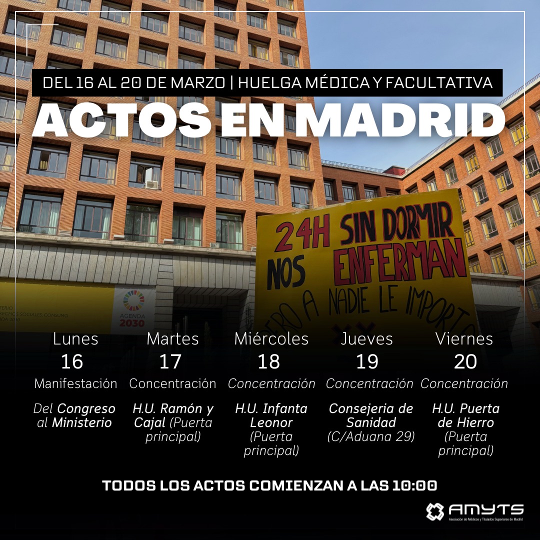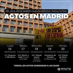 En el caso de Madrid, AMYTS ha convocado una manifestación el lunes, a las 10.00 horas, que partirá desde el Congreso de los Diputados hasta el Ministerio de Sanidad. Asimismo, todos los días se celebrarán concentraciones, a las 11.00 horas, frente a la sede ministerial.
