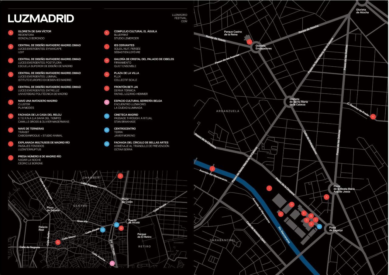 También se incluyen 'Blueprint', del Studio Lemercier, en el complejo cultural El Águila (Arganzuela); 'Soleil Nuit, Persée', de Sébastien Lefèvre, en el IES Cervantes (Centro); 'Firmamento', de Quiet Ensemble, en la Galería de Cristal del Palacio de Cibeles (Retiro); 'Flux', de Collectif Scale, en la plaza de la Villa (Centro) y 'Deriva Térmica', de Rafael Lozano-Hemmer, en el Frontón Beti Jai (Chamberí).