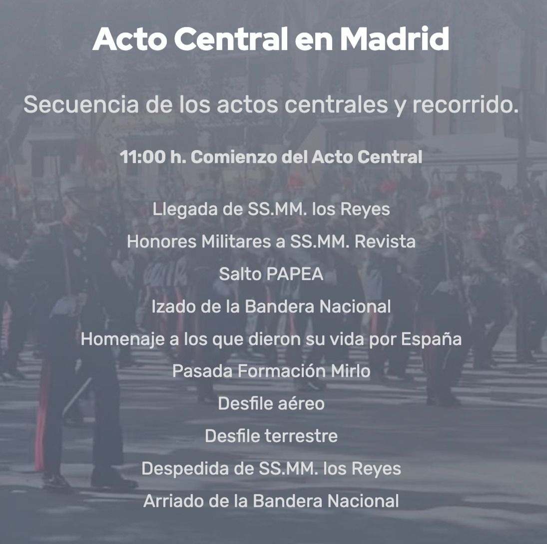 El acto central del Día de la Fiesta Nacional arrancará a las 11.00 horas con la llegada de Sus Majestades los Reyes, para después proceder al izado de la bandera nacional, un homenaje a que dieron su vida por España y, a continuación, el citado desfile aéreo y el terrestre, que discurrirá desde la glorieta del Emperador Carlos V y la plaza de Colón.