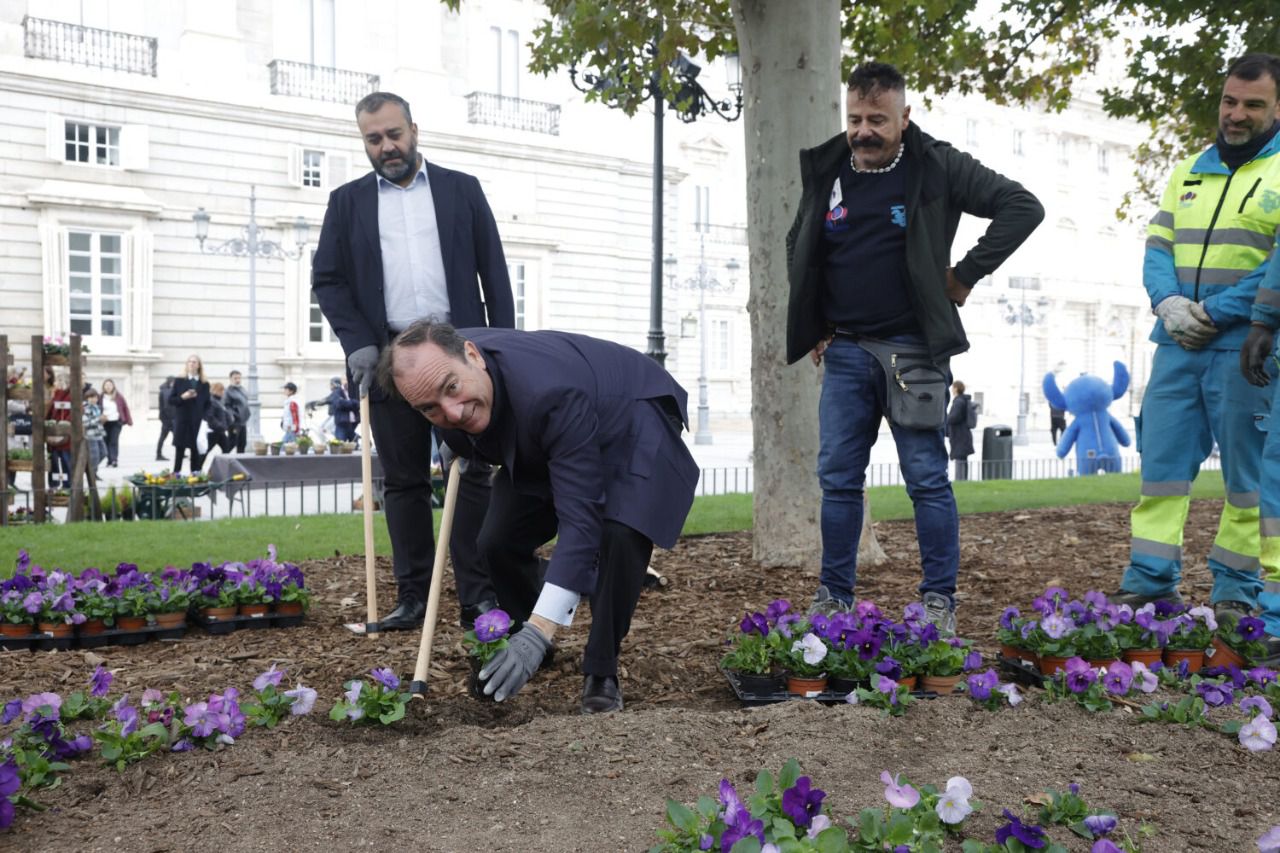 El delegado de Urbanismo, Medio Ambiente y Movilidad, Borja Carabante, y el concejal del distrito de Centro, Carlos Segura, han visitado la plaza de Oriente, donde han presentado la campaña de plantación de flor de temporada otoño-invierno, que se concretará con 592.935 flores en las zonas verdes de los distritos y 176.356 en parques históricos y singulares.