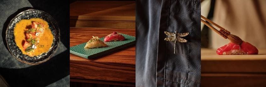 La experiencia arranca con el 'Sakizuke', un ebi dumpling crujiente de langostinos con cacahuete, salsa chili jam y cacao y sigue con el 'Otsukuri', el segundo acto con tres platos como la ventresca de atún al estilo pa amb tomaquet, el gyutataki con ponzu y ajo confitado o el nigiri de lubina con miso y chocolate, mientras que el acto central es el capítulo dedicado al Sushi, donde se puede elegir entre varias propuestas, desde el 'Age Shari To Kinoko', una cazuela de setas y arroz de sushi frito con salsa sukiyaki; a la selección de sushi (seis piezas), que ofrece un recorrido por sabores y técnicas con Nigiri Akami Swicy, Nigiri Chutoro Dijon, Nigiri de Lubina con miso y chocolate, Nigiri de lomo bajo madurado en mole y Gunkan Huevo Benedictine, donde el chocolate se integra con sutileza, mientras que para terminar un delicioso mochi de avellana y chocolate y todo regado con bebidas y un cóctel especial o una copa de Champagne Taittinger Brut Réserve.